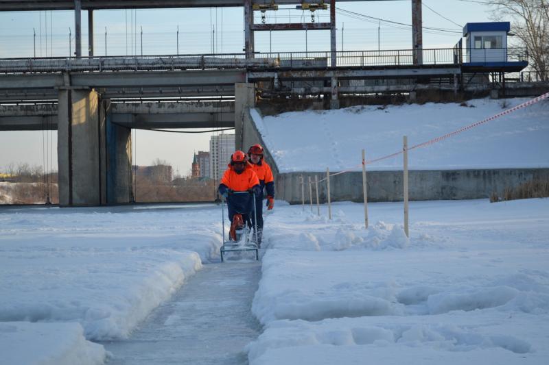Лед на реке разрушают бензопилами, установленными на специальных санях. Эту конструкцию разработали на самом предприятии, и она уже не раз показала свою эффективность на практике.
